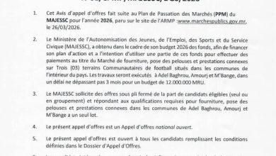 إطلاق مناقصة وطنية لتجهيز ثلاثة ملاعب بلدية بالعشب في الداخل الموريتاني