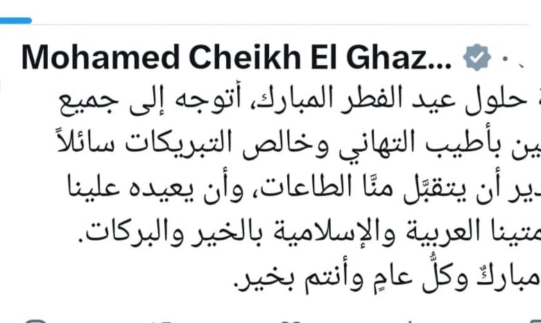 “بمناسبة حلول عيد الفطر المبارك، أتوجه إلى جميع المواطنين بأطيب التهاني وخالص التبريكات سائلاً الله القدير أن يتقبَّل منَّا الطاعات، وأن يعيده علينا وعلى أمتينا العربية والإسلامية بالخير والبركات. عيدكُم مباركٌ وكلُّ عامٍ وأنتم بخير”.