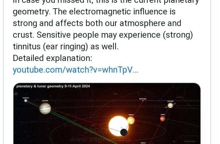 كما أرفق بالتغريدة آخر نشرة فلكية نشرها على حسابه وحساب الهيئة الفلكية التي يرأسها SSGEOS، والتي أشار فيها إلى اقترانات بالكواكب أيام 9 و10 و11 أبريل، والتي تشمل أربعة اقترانات كوكبية، قائلاً: “سيكون ذلك بالغ الأهمية”.