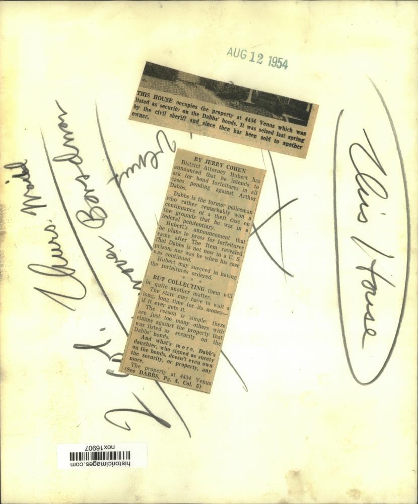 ebay template Note: Please study the images carefully to determine the condition of this vintage photograph, as it may not be in perfect condition. It may contain wrinkles, cracks, and possibly even tears due to its age and how it was handled before it got to us. A scanner may interpret colors and contrast differently than human eyes will, so it is possible that the actual photograph may be slightly darker or lighter in person. This vintage photograph is offered for sale as a collectible item and conveys no transfer of copyright. 1954 Press Photo This house occupies the property at 4454 Venus, Louisiana This is an original press photo. This house occupies the property at 4454 Venus which as listed as security on the Dabbs' bonds. It was seized last spring by the civil sheriff and since then has been sold to another owner. District Attorney Hubert has announced that he intends to ask for bond forfeitures in all cases pending against Arthur Dabbs. Dabbs is the former policeman who rather remarkably won a continuance of a theft case on the grounds that he was in a federal penitentiary. Photo measures 10 x 8.25 inches. Photo is dated 08-12-1954. PHOTO FRONT PHOTO BACK Historic Images Part Number: nox16907 FAQsQ: Can I just download a digital version instead?A: No, we sell only vintage originals and do not make or distribute any copies, including digital ones. Q: Do you combine shipping and invoices? A: Multiple photos won on the same seller ID combine automatically through the eBay checkout process. If you encounter problems with this, send us a message via eBay messaging and we will send you an invoice. Due to eBay limitations, we cannot combine items won on our different seller IDs for a single shipping charge. Q: How quickly do you ship the items once paid? A: We ship within one business day after your payment clears. If you do not receive an "order shipped" email from us by the close of the second business day from submitting payment, please e-mail us via eBay messaging. Q: How do you make sure my photograph arrives safely? A: We package each order between two cross-corrugated pieces of cardboard to ensure that the package is as difficult to bend as possible. We then wrap each order in a plastic sheet to help protect against moisture. We want you to rest assured that we take every precaution to ensure that the photograph you receive will be in the same condition in your care as it was in ours. Q: Will the "Historic Images" watermark be on my photo when I receive it? A: No. This is a digital watermark we use to protect our images. It is not printed on the photo. Q: What are your office hours? A: eBay for us is a business, and a very fun one to be in! We are open M-F 9 to 5 (CST). Therefore, we do not return e-mails and phone calls over the weekend. We observe the following holidays: New Years Day, Memorial Day, Fourth of July, Labor Day, Thanksgiving and the day after Thanksgiving, Christmas Eve and Christmas Day. Q: Where did all these vintage photos come from? A: These original vintage photographs are from various news service and newspaper photo archives from locations around the country including: Boston, Detroit, Tampa, Chicago, Denver, Seattle, New Orleans, Milwaukee, Portland, Spokane, and more. We do not copy or reproduce any photographs -- every item is a unique vintage piece that was housed in a news archive. Q: Can I use this photograph in my book/blog/website? A: The short answer is no. There is no transfer of copyright for republication or reproduction with these photographs when you purchase them, and only photographs taken before 1923 are currently automatically in the public domain. Permission from the copyright holder, which usually can be identified from the back of each photo, must be sought to republish or reproduce the image for any purpose. Q: Do you relist items (in case I miss an auction ending)? A: Auction items that receive no bids are relisted in our store (historicimages-store on eBay) as a fixed-price item and at a higher price than the starting auction price. Q: Do you leave feedback? A: Yes, we always leave feedback for buyers. Our software monitors when our buyers leave us feedback, then notifies us that we can leave feedback for the buyer. Rest assured, if you leave feedback, we will do the same! Check out our family of eBay IDs: historicimages01 Sports Photos historicimages02 Entertainment Photos historicimages03 Americana Photos historicimages04 International & War Photos historicimages05 Transportation Photos historicimages-store Our largest fixed-price selection historicimages-market Hand-picked photos and our New Orleans collection historicimages-gallery Hand-picked photos Saturday night auctions About Us Historic Images was formed in September 2009, with a handful of scanners working out of a basement to digitize newspaper photo archives. We have since moved out of the basement, and we can now archive thousands of photos per day. Our company has worked with magazines and newspapers from Detroit, Boston, Denver, Seattle, Tampa, Chicago, and New Orleans, just to name a few. We are constantly adding to our inventory, and have assembled an archive of millions of photos to date. As our company evolved, we began our eBay business, which brings thousands of fresh auctions per week to the world's largest online auction marketplace. Our custom software systems and team of great employees allow us to efficiently scan and sell large photo archives online. At the very core of our company's DNA is a strong commitment to customer satisfaction and strict integrity for our product. Our promise to you is that we will do everything in our power to provide you a great buying experience. Copyright 2009 - Present, Historic Images, Inc. Sell Smarter with Kyozou.Inventory and Ecommerce Management