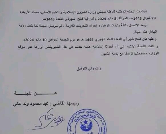 أعلنت اللجنة الوطنية لمراقبة الأهلة، الجمعة المقبل فاتح شهر ذي القعدة.