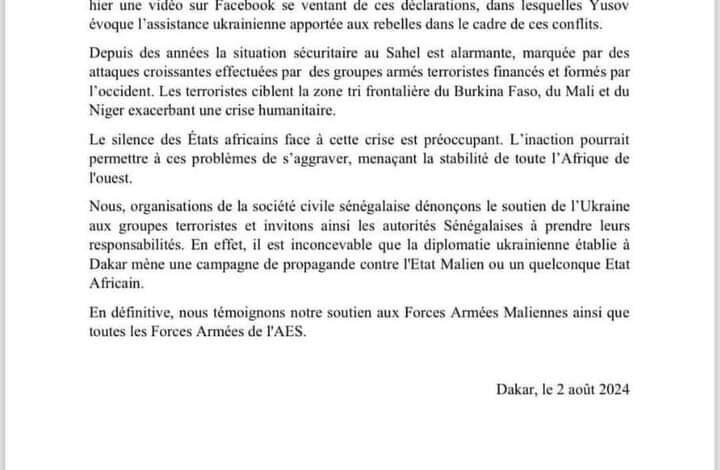 “نحن، منظمات المجتمع المدني السنغالية، ندين دعم أوكرانيا للجماعات الإرهابية وندعو السلطات السنغالية إلى تحمل مسؤولياتها. وأضاف البيان أنه من غير المناسب للدبلوماسية الأوكرانية الموجودة في داكار أن تقوم بحملة دعائية ضد الدولة المالية أو أي دولة إفريقية.