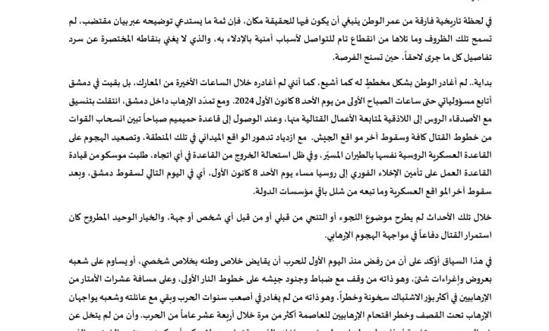 بداية.. لم أغادر الوطن بشكل مخططٍ له كما أشيع، كما أنني لا أغادره خلال الساعات الأخيرة من المعارك، بل بقيت في دمشق أتابع مسؤولياتي حتى ساعات الصباح الأولى من يوم الأحد 8 كانون الأول 2024. ومع تمدّد الإرهاب داخل دمشق، انتقلت بتنسيق مع الأصدقاء الروس إلى اللاذقية لمتابعة الأعمال القتالية منها، وعند الوصول إلى قاعدة حميميم صباحاً تبين انسحاب القوات من خطوط القتال كافة وسقوط آخر مواقع الجيش. مع ازدياد تدهور الواقع الميداني في تلك المنطقة، وتصعيد الهجوم على القاعدة العسكرية الروسية نفسها بالطيران المسيّر، وفي ظل استحالة الخروج من القاعدة في أي اتجاه، طلبت موسكو من قيادة القاعدة العمل على تأمين الإخلاء الفوري إلى روسيا مساء يوم الأحد 8 كانون الأول، أي في اليوم التالي لسقوط دمشق، وبعد سقوط آخر المواقع العسكرية وما تبعه من شلل باقي مؤسسات الدولة.