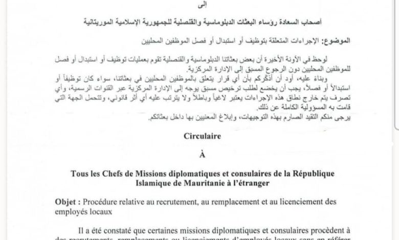 وجهت وزارة الشؤون الخارجية والتعاون والموريتانيين في الخارج تعميماً رسميًا إلى رؤساء البعثات الدبلوماسية والقنصلية الموريتانية في الخارج، شددت فيه على ضرورة الالتزام الصارم بالإجراءات القانونية المتعلقة بتوظيف أو استبدال أو فصل الموظفين المحليين العاملين في هذه البعثات.