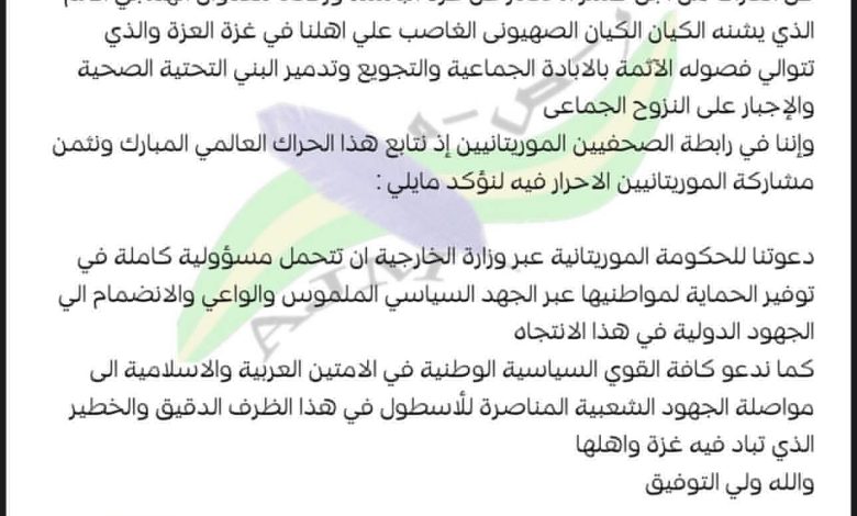 أعلنت رابطة الصحفيين الموريتانيين في بيان أصدرته مساء اليوم متابعتها باهتمام للحشد الجماهيري العالمي المنخرط في أسطول الحرية العالمي، الهادف إلى كسر الحصار المفروض على غزة، مؤكدة تضامنها الكامل مع الجهود الدولية الرامية إلى مواجهة العدوان الإسرائيلي على الشعب الفلسطيني.