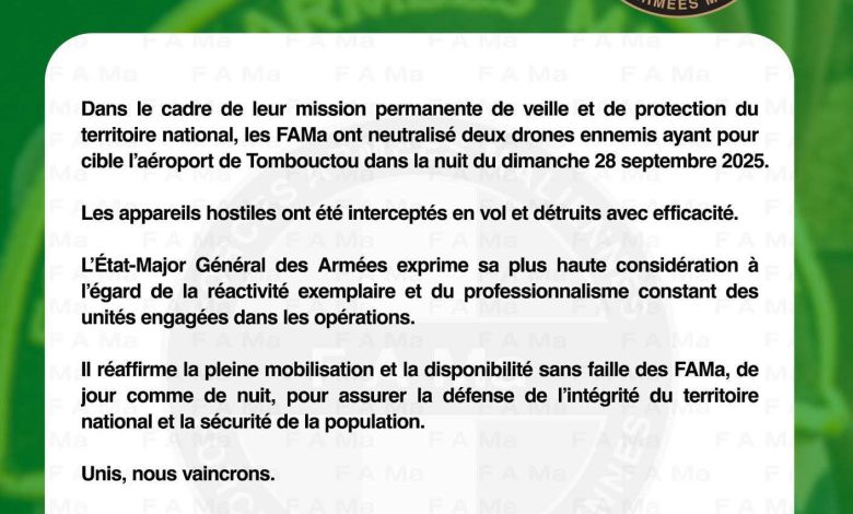 أعلنت القوات المسلحة المالية (فاما) أنها تمكنت، ليلة الأحد 28 سبتمبر 2025، من اعتراض وتدمير طائرتين مسيّرتين معاديتين كانتا تستهدفان مطار مدينة تمبكتو شمالي البلاد.