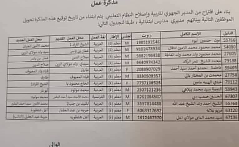 أصدر والي نواكشوط الشمالية أطفيله محمدن حادن مذكرة عمل تقضي بتحويل عدد من عمال المصالح الجهوية التابعة للولاية، وذلك بناءً على تقارير اللجان المختصة بالتربية والشؤون الإدارية.