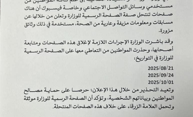 وجددت الوزارة التأكيد على أن صفحتها الرسمية هي القناة الوحيدة الموثوقة لنشر أخبارها وإعلاناتها، محذرةً من الانسياق وراء الأخبار الكاذبة التي تروجها الصفحات المنتحلة.
