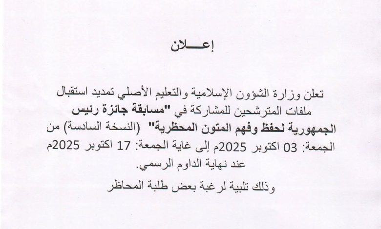 وزارة الشؤون الإسلامية تعلن تمديد فترة استقبال ملفات مسابقة جائزة رئيس الجمهورية لحفظ وفهم المتون المحظرية