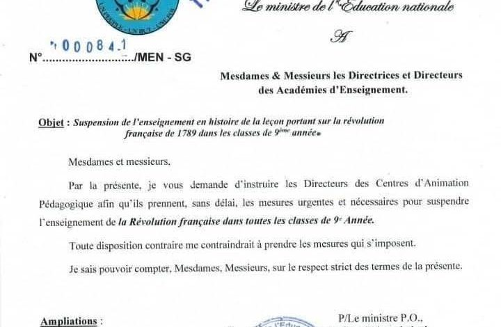 أصدر وزير التعليم الوطني في جمهورية مالي، اليوم الخميس 9 أكتوبر 2025، تعميماً عاجلاً يقضي بـ تعليق تدريس درس “الثورة الفرنسية عام 1789” في مادة التاريخ، المقرر في الصف التاسع الأساسي بجميع المؤسسات التعليمية في البلاد.