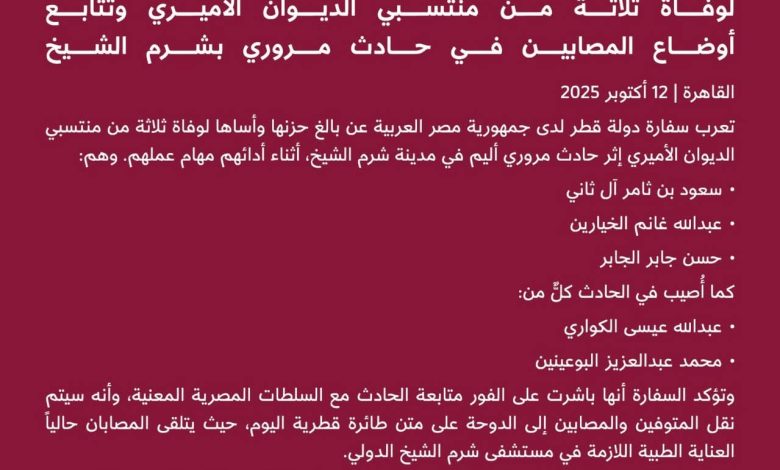 سفارة قطر بالقاهرة تعلن وفاة ثلاثة من منتسبي الديوان الأميري في حادث مروري بشرم الشيخ