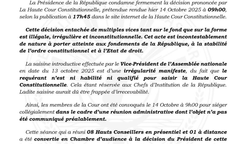 أصدرت رئاسة جمهورية مدغشقر قبل قليل بيانًا شديد اللهجة على صفحتها الرسمية ترفض فيه بشكل قاطع القرار الصادر عن المحكمة الدستورية في 14 أكتوبر، والذي نُشر على موقع المحكمة عند الساعة 17:45.