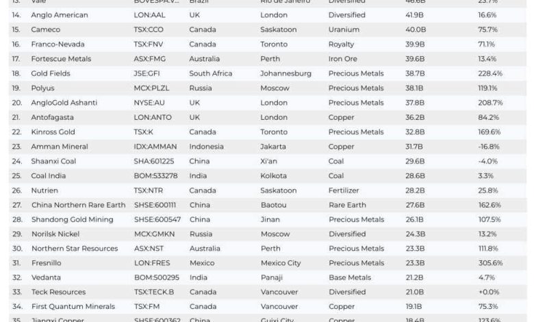 شملت قائمة أكبر 50 شركة تعدين لعام 2025 شركات من: