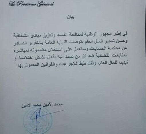 وأوضح البيان الصادر عن المدعي العام لدى المحكمة العليا، السيد محمد الأمين محمد الأمين، أن النيابة العامة ستستغل ما ورد في تقرير محكمة الحسابات من معلومات ومعطيات لفتح ومباشرة المتابعات القضائية ضد كل من تُسند إليه أفعال تشكل اختلاسًا أو تبديدًا للمال العام، وذلك طبقًا للإجراءات والقوانين المعمول بها في البلاد.