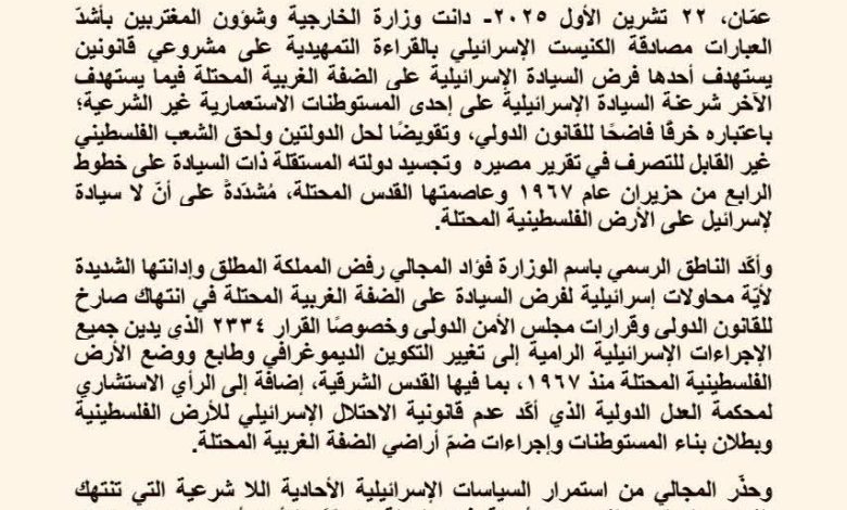 أدانت وزارة الخارجية وشؤون المغتربين الأردنية بأشد العبارات مصادقة الكنيست الإسرائيلي، بالقراءة التمهيدية، على مشروعي قانونين يستهدف أحدهما فرض السيادة الإسرائيلية على الضفة الغربية المحتلة، فيما يسعى الآخر إلى شرعنة السيطرة على إحدى المستوطنات الاستعمارية غير الشرعية.