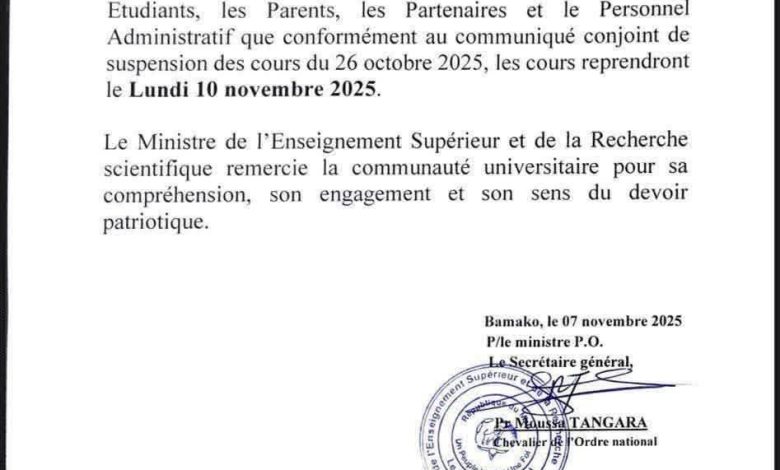 أعلن وزير التعليم العالي والبحث العلمي في جمهورية مالي عن استئناف الدروس في الجامعات والمعاهد العليا ابتداءً من يوم الاثنين 10 نوفمبر 2025، وذلك بعد فترة التوقف المؤقت التي بدأت في 26 أكتوبر الماضي، بموجب بيان مشترك سابق.