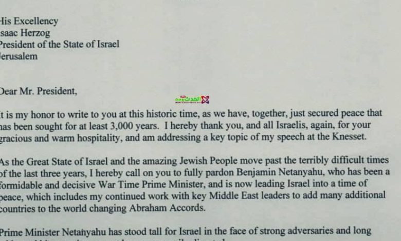 الرئيس الأمريكي ترمب يطلب رسميًا من الرئيس الإسرائيلي يتسحاق هرتسوغ العفو عن نتنياهو