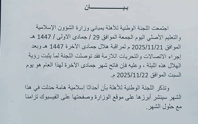 أعلنت اللجنة الوطنية للأهلة أن غدا السبت الموافق 22 نوفمبر 2025 هو فاتح شهر جمادى الآخرة 1447 هـ، وذلك بعد رؤية الهلال مساء الجمعة في جميع أنحاء البلاد.