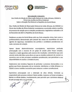 وقالت البعثات، في بيان مشترك صدر اليوم، إن عملية التصويت جرت في أجواء وُصفت بالسلمية والمنظمة، مشيدة بالتزام الشعب البيساوي وروح المهنية التي تحلّى بها مسؤولو مراكز الاقتراع وقوات الأمن وممثلو الأحزاب السياسية والمرشحون الرئاسيون.