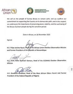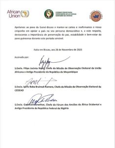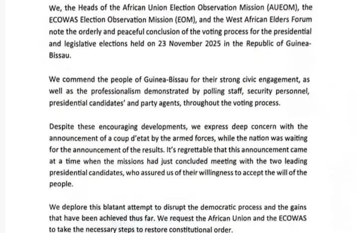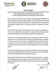 أدانت بعثات مراقبة الانتخابات التابعة للاتحاد الإفريقي، والمجموعة الاقتصادية لدول غرب إفريقيا (الإيكواس)، ومنتدى حكماء إفريقيا الغربية، اليوم الأربعاء، ما وصفته بـ”محاولة الانقلاب الفاضحة” في غينيا بيساو، وذلك عقب الانتخابات الرئاسية والتشريعية التي جرت في 23 نوفمبر 2025.