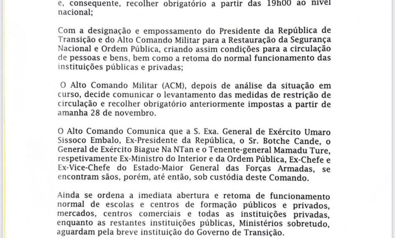 رفعت القيادة العسكرية العليا في غينيا بيساو، اليوم الخميس، القيود التي كانت مفروضة على حركة المواطنين والمركبات منذ أحداث 26 نوفمبر 2025، معلنةً انتهاء العمل بحظر التجول ابتداءً من يوم غد الجمعة.