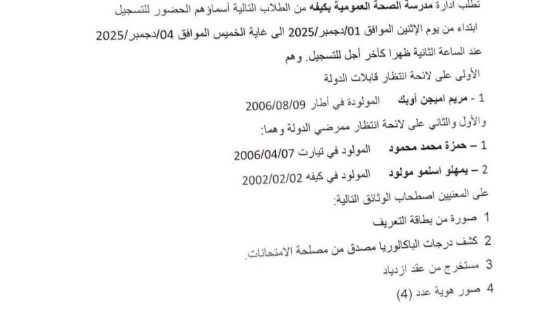أعلنت مدرسة الصحة العمومية بكيفه عن استدعاء مجموعة من الطلاب المدرجة أسماؤهم في لوائح انتظار قابلات الدولة ومرضى الدولة، وذلك من أجل استكمال إجراءات التسجيل ابتداءً من يوم الاثنين 1 ديسمبر 2025 وحتى الخميس 4 ديسمبر 2025 عند الساعة الثانية زوالاً كآخر أجل.