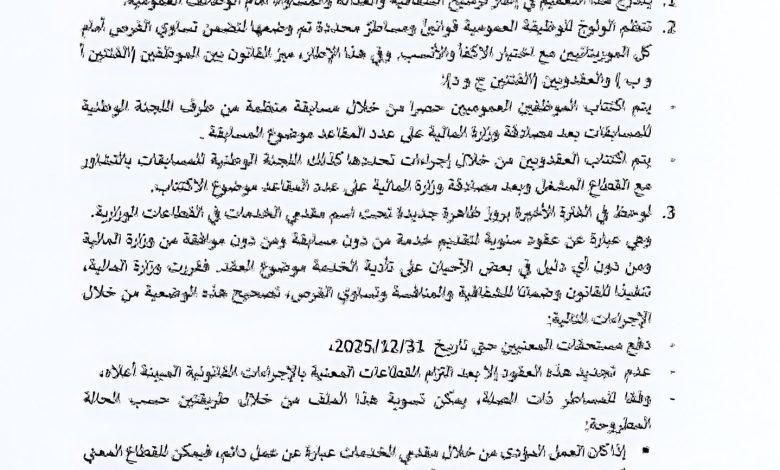 وختمت الوزارة بيانها بالتأكيد على أن الإجراءات الجديدة ترمي إلى تنظيم سوق العمل العمومي، وترسيخ إصلاح شامل لمبادئ الشفافية وتساوي الفرص بين المواطنين.