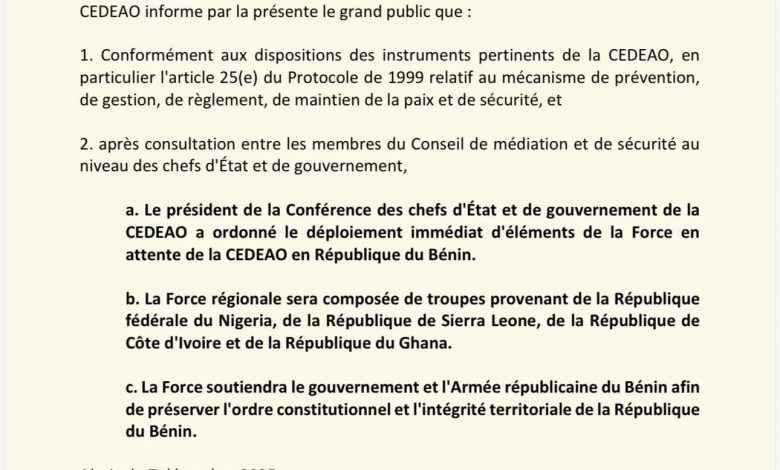 وبحسب البيان، فقد أمر رئيس مؤتمر رؤساء دول وحكومات ECOWAS بنشر وحدات من القوة الاحتياطية التابعة للمنظمة بشكل فوري في بنين، في خطوة تهدف إلى احتواء الوضع الميداني وتقديم الدعم المؤسساتي والعسكري للسلطات القائمة.