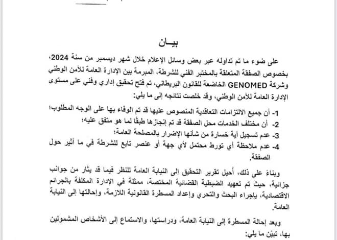وأكدت النيابة، في بيان صادر عنها، أن نتائج التحقيق الإداري والفني الذي أجرته الإدارة العامة للأمن الوطني أثبتت تنفيذ جميع الالتزامات التعاقدية المرتبطة بالصفقة بشكل كامل، وأن الخدمات المقدمة كانت مطابقة لما تم الاتفاق عليه، دون تسجيل أي خسارة أو خرق يمس المصلحة العامة.