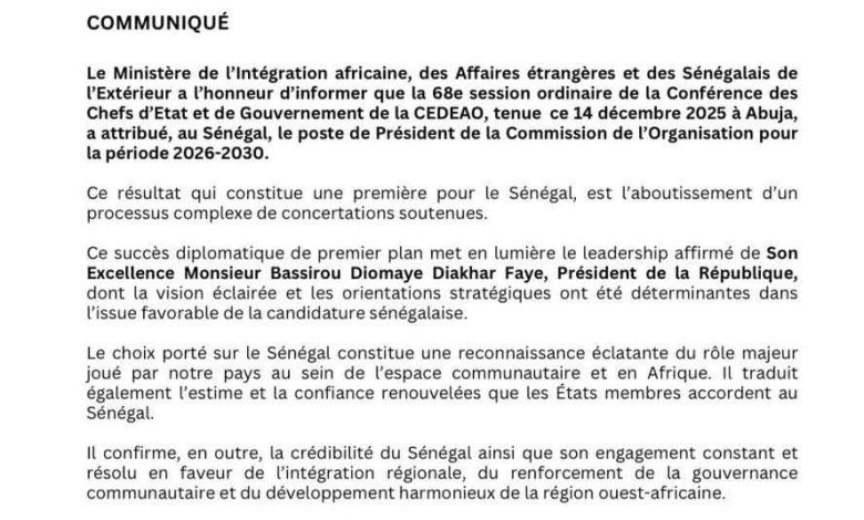 أعلنت وزارة الاندماج الإفريقي والشؤون الخارجية والسنغاليين في الخارج، أن مؤتمر رؤساء دول وحكومات المجموعة الاقتصادية لدول غرب إفريقيا (الإيكواس)، في دورته العادية الـ68 المنعقدة يوم 14 ديسمبر 2025 بالعاصمة النيجيرية أبوجا، منح السنغال منصب رئيس مفوضية الإيكواس للفترة الممتدة من 2026 إلى 2030.
