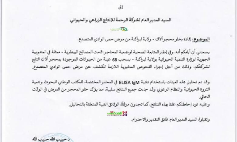 وأظهرت نتائج التحاليل أن جميع العينات كانت سلبية، مما يؤكد خلو المحجر من مرض حمى الوادي المتصدع في الوقت الراهن، ويعكس فعالية إجراءات المراقبة الصحية المعتمدة.