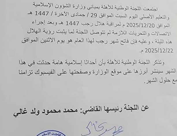 وأكدت اللجنة، في بيانها أنها عقدت اجتماعها بمقر الوزارة وتحرت الرؤية عبر مختلف ربوع البلاد، ولم تتوصل لما يثبت دخول الشهر، وبالتالي يكون الإثنين هو فاتح رجب.