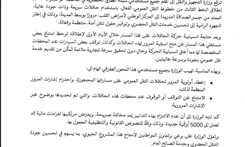 كما أعربت الوزارة عن ثقتها في وعي المواطنين وتعاونهم من أجل إنجاح هذا المشروع الذي يخدم الصالح العام ويسهم في تطوير النقل الحضري بالعاصمة.