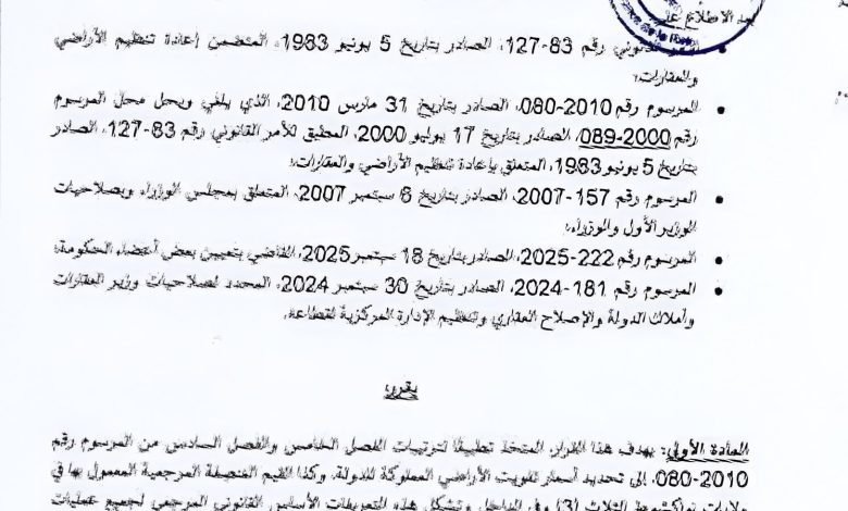 مقرر يحدد أسعار التنازل والقيمة المنصفة المرجعية للقطع الأرضية