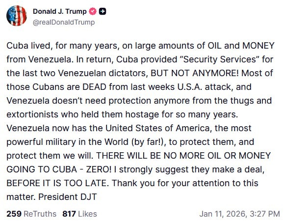 حذّر الرئيس الأمريكي دونالد ترامب كوبا من أنها لن تتلقى بعد الآن النفط الفنزويلي أو أي دعم مالي، مؤكدًا أن الولايات المتحدة ستقدّم دعماً عسكريًا لفنزويلا في المرحلة الحالية.