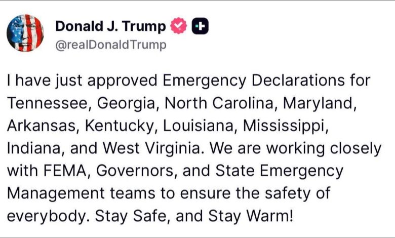 ترامب يوافق على إعلان حالة الطوارئ في 10 ولايات أميركية تحسبًا لعاصفة برد شديدة