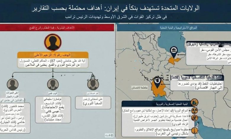 كشفت تقارير إعلامية متداولة عن إعداد الولايات المتحدة لما وصف بـ“بنك أهداف محتمل” داخل إيران، في ظل تصاعد التوتر الإقليمي، واستمرار حشد القوات الأميركية في الشرق الأوسط، إلى جانب تهديدات متكررة أطلقها الرئيس الأميركي دونالد ترامب تجاه طهران.