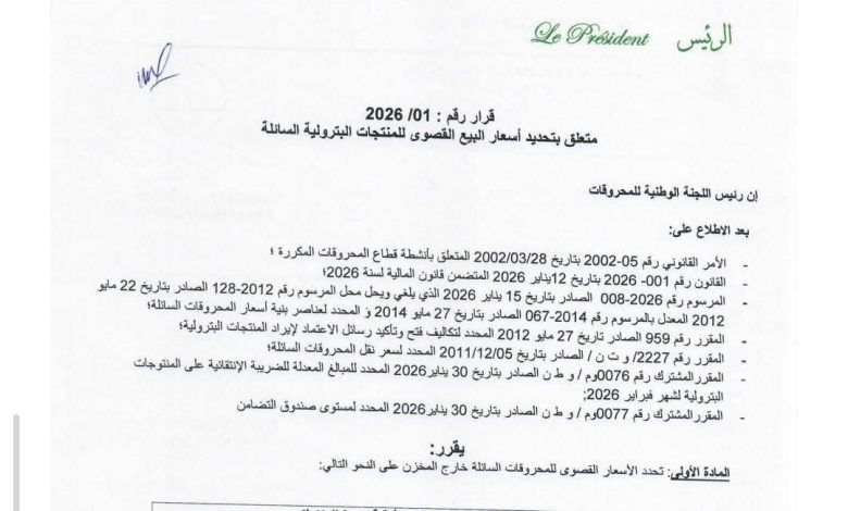 وأوضح القرار أن تحديد هذه الأسعار جاء استنادًا إلى جملة من النصوص القانونية والتنظيمية، من بينها القوانين والمراسيم المنظمة لقطاع المحروقات، وآليات احتساب التكاليف والضرائب، إضافة إلى القرارات المشتركة الصادرة خلال شهر يناير 2026.
