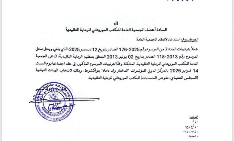 وجاء هذا الاستدعاء، وفق مذكرة صادرة عن الوزير بتاريخ 6 فبراير 2026، تطبيقًا لمقتضيات المادة السابعة من المرسوم رقم 176-2025 الصادر بتاريخ 12 ديسمبر 2025، الذي يلغي ويحل محل المرسوم رقم 118-2013 الصادر بتاريخ 2 يوليو 2013، المنظم للمكتب الموريتاني للرماية التقليدية.