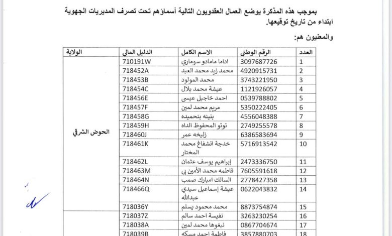 وجاء في المذكرة أن القرار يشمل عدداً من العمال المتعاقدين، حيث تم توزيعهم على عدد من الولايات، من بينها الحوض الشرقي والحوض الغربي، وذلك في إطار تعزيز أداء المصالح الجهوية وتحسين مستوى الخدمات الاجتماعية المقدمة للمواطنين.