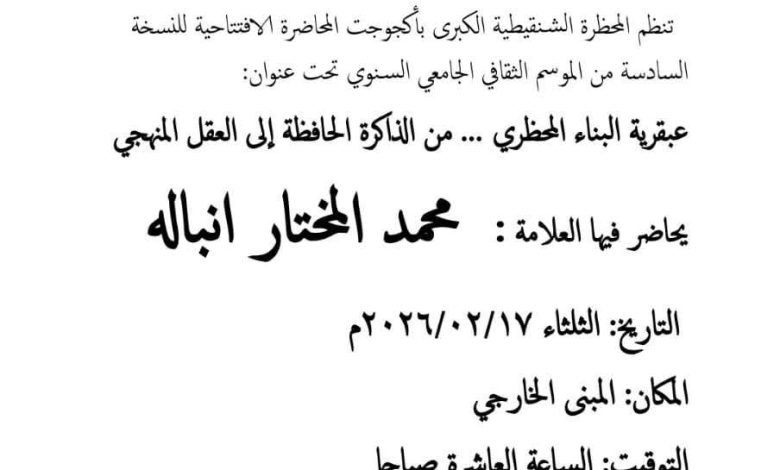 وستتناول المحاضرة موضوع “عبقرية البناء الحضاري… من الذاكرة الحافظة إلى العقل المنهجي”، حيث سيقدمها العلامة محمد المختار انباله، في إطار تعزيز الحراك الثقافي والعلمي، وتسليط الضوء على أدوار الذاكرة العلمية والمنهجية الفكرية في بناء الحضارات.