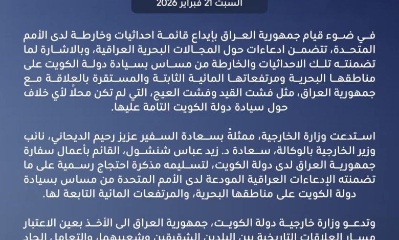 أصدرت وزارة الخارجية الكويتية، اليوم السبت 21 فبراير 2026، بياناً أعربت فيه عن رفضها لما تضمنته الإحداثيات والخرائط التي أودعتها جمهورية العراق لدى الأمم المتحدة، بشأن ادعاءات تتعلق بالمجالات البحرية.