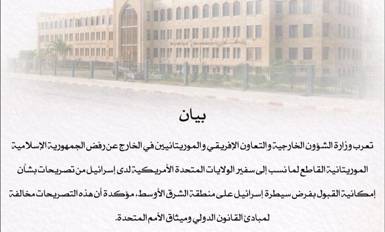 أعربت وزارة الشؤون الخارجية والتعاون الإفريقي والموريتانيين في الخارج، في بيان صادر اليوم السبت، عن رفض الجمهورية الإسلامية الموريتانية القاطع لما نُسب إلى سفير الولايات المتحدة الأمريكية لدى إسرائيل من تصريحات بشأن إمكانية القبول بفرض سيطرة إسرائيل على منطقة الشرق الأوسط.