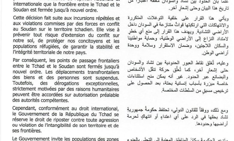 وأوضح البيان أن جميع نقاط العبور الحدودية بين تشاد والسودان سيتم إغلاقها، كما سيتم تعليق حركة تنقل الأشخاص والبضائع عبر الحدود. وأشار إلى إمكانية منح استثناءات إنسانية خاصة، شريطة الحصول على ترخيص مسبق من السلطات المختصة.