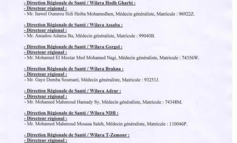 وشملت التغييرات ثماني إدارات جهوية للصحة في ولايات الحوض الغربي والعصابة وكوركل والبراكنة وآدرار وداخلت نواذيبو وتيرس الزمور وإينشيري.