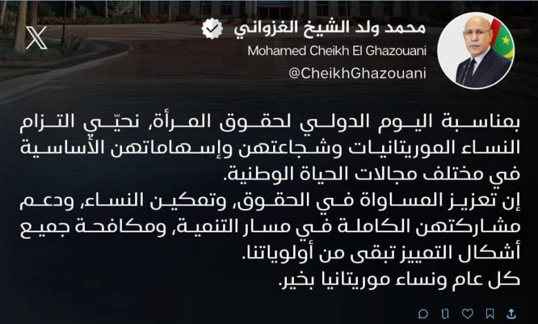 وقال الرئيس الغزواني، في تغريدة نشرها على منصة إكس بمناسبة اليوم الدولي لحقوق المرأة، إن دعم النساء وتمكينهن يشكلان ركيزة أساسية في مسار التنمية، مؤكدًا أن تعزيز المساواة في الحقوق يظل من أولويات العمل الوطني.