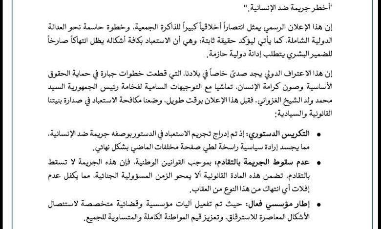وأضافت أن هذا الاعتراف الدولي يكتسي أهمية خاصة بالنسبة لموريتانيا، التي تبنّت منذ وقت مبكر مقاربة قانونية ومؤسسية لمكافحة الاستعباد، شملت تجريمه دستورياً باعتباره جريمة ضد الإنسانية، وعدم سقوطه بالتقادم، إلى جانب إنشاء آليات مؤسسية وقضائية متخصصة للتصدي لمختلف أشكاله.