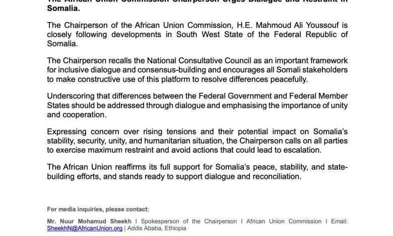 وأكد رئيس مفوضية الاتحاد الإفريقي، محمود علي يوسف، أنه يتابع عن كثب تطورات الوضع في جمهورية الصومال الفيدرالية، مشدداً على أهمية اللجوء إلى الآليات الحوارية القائمة لتجاوز الخلافات.