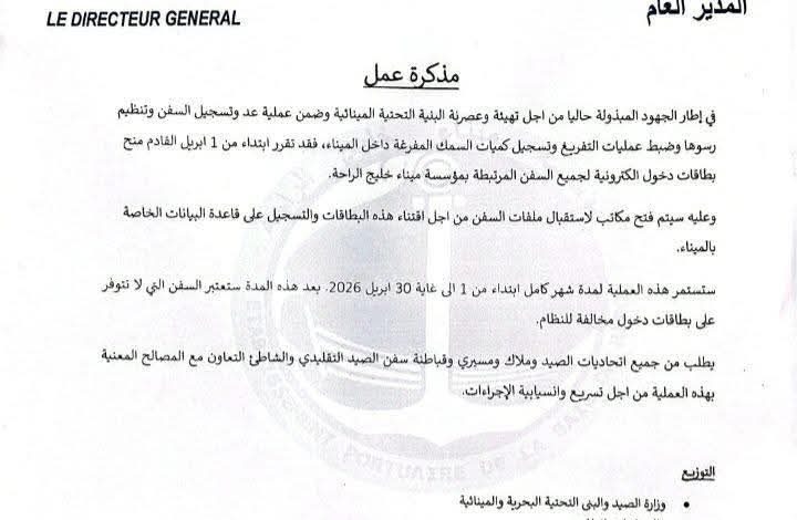 وأوضح المدير العام للمؤسسة السيد مختار ملل جا، في مذكرة عمل صادرة اليوم 31 مارس 2026، أن هذه الخطوة تشمل اعتماد بطاقات دخول إلكترونية لفائدة جميع السفن المرتبطة بالميناء، ابتداءً من فاتح أبريل المقبل، وذلك بهدف ضبط عمليات التفريغ وتسجيل كميات الأسماك المفرغة داخل الحوض المينائي.