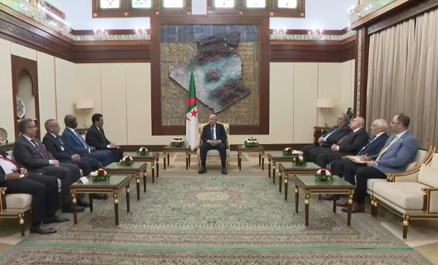 وجرى اللقاء بحضور عدد من كبار المسؤولين الجزائريين، من بينهم مدير ديوان رئاسة الجمهورية بوعلام بوعلام، ووزير الدولة وزير الشؤون الخارجية والجالية الوطنية بالخارج والشؤون الإفريقية أحمد عطاف، إلى جانب المستشار لدى رئيس الجمهورية المكلف بالشؤون الدبلوماسية عمار عبة، وسفير الجزائر لدى موريتانيا أمين صيد.